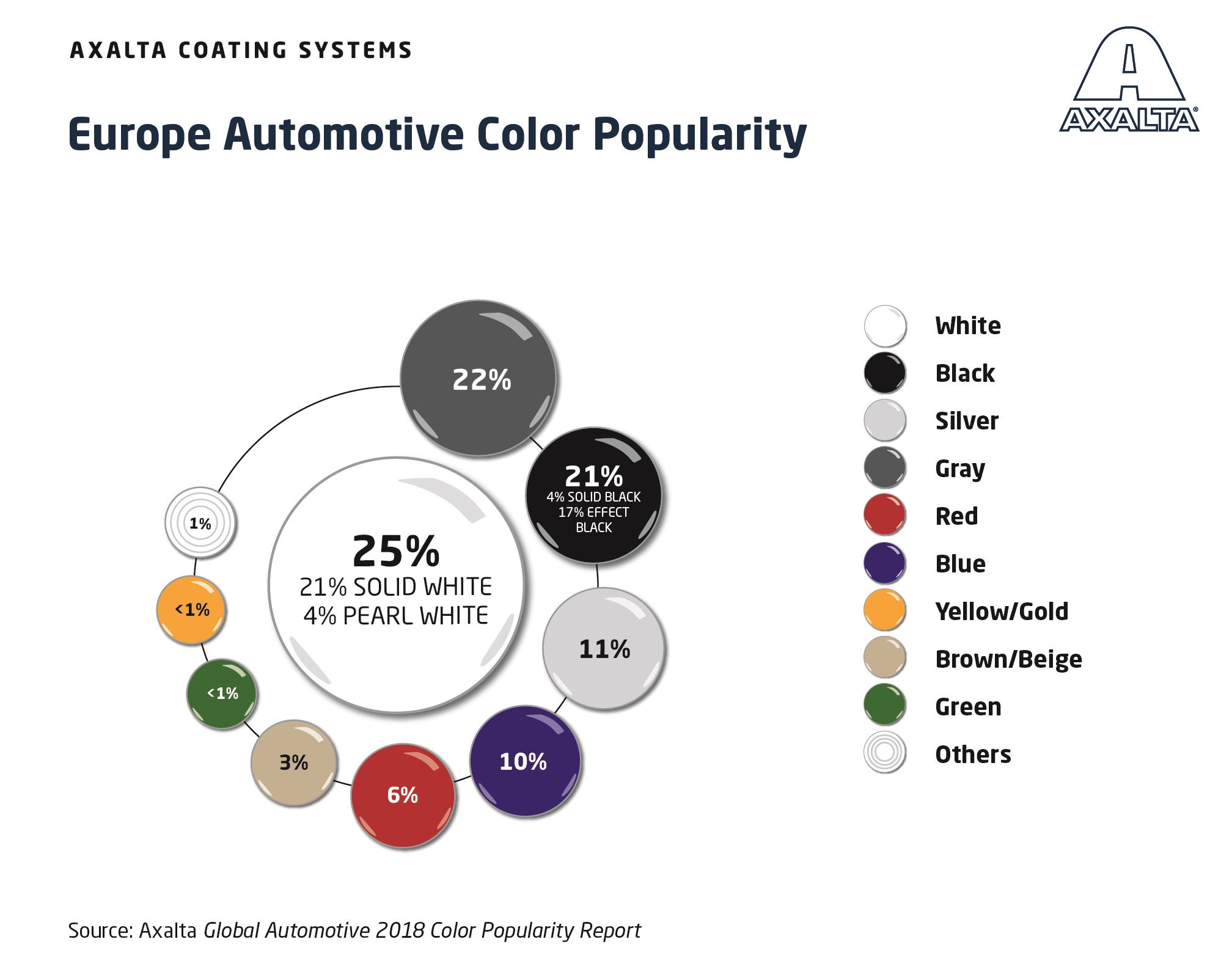 Celosvětovým trendem posledních let byla bílá barva, která meziročně poklesla z 39 na 38% (což je přesný opak předloňského růstu). Tento trend táhne zejména prodej nových vozidel v Číně, kde bílá barva zcela dominuje s 62% nově prodaných vozidel.